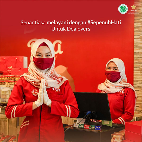Seorang wanita dengan senyum yang hangat datang mendekat, mengenakan seragam Dea Bakery & "Selamat pagi! Apa yang bisa saya bantu untuk Anda hari ini?" ucapnya dengan ramah.